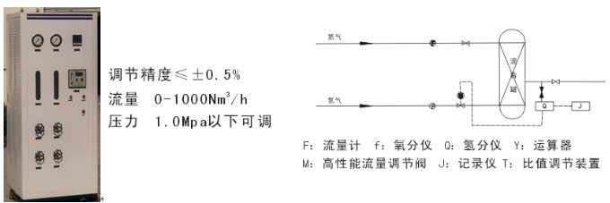一臺(tái)氮?dú)鈿錃馀浔妊b置主要由氮?dú)饬髁坑?jì)、氫氣流量計(jì)、氫氣分析儀、PID控制器、流量調(diào)節(jié)閥、壓力表、混合罐、機(jī)箱等組成。