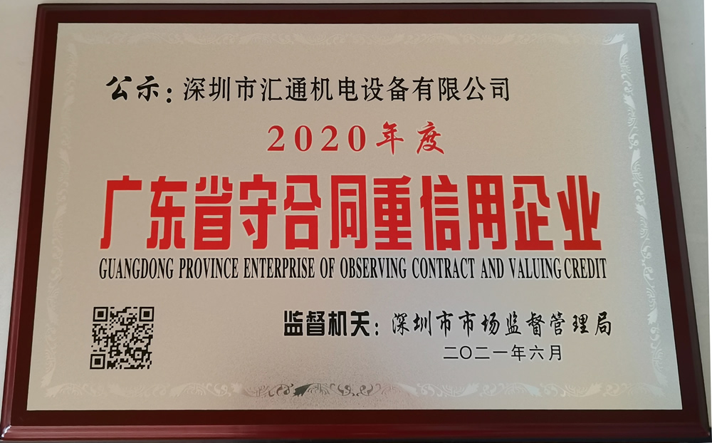 近日,廣東省市場監(jiān)督管理局公布了“2020年度廣東省守合同重信用企業(yè)”名單。深圳市匯通機電設備有限公司憑借良好的社會信譽、誠實守信的經(jīng)營原則、健全的合同管理體系及完善的售后服務流程體系,被授權“2020年度廣東省守合同重信用企業(yè)”的榮譽稱號。 “誠信者,天下之結(jié)也”。誠信是一個企業(yè)的立身之本,亦是維護市場經(jīng)濟秩序的重要原則。