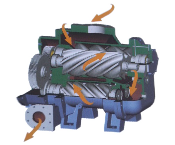 自然空氣通過空氣過濾器進入第一級壓縮,在壓縮腔與少量潤滑油混合,同時將混合氣體壓縮到級間壓力,壓縮后的氣體進入冷卻通道,與大量油霧接觸,從而大大降低了溫度,降溫后的壓縮氣體進入第二級轉子,進行二次壓縮,被壓縮到最終排氣壓力。最后通過排氣法蘭排除壓縮機,完成整個壓縮過程。